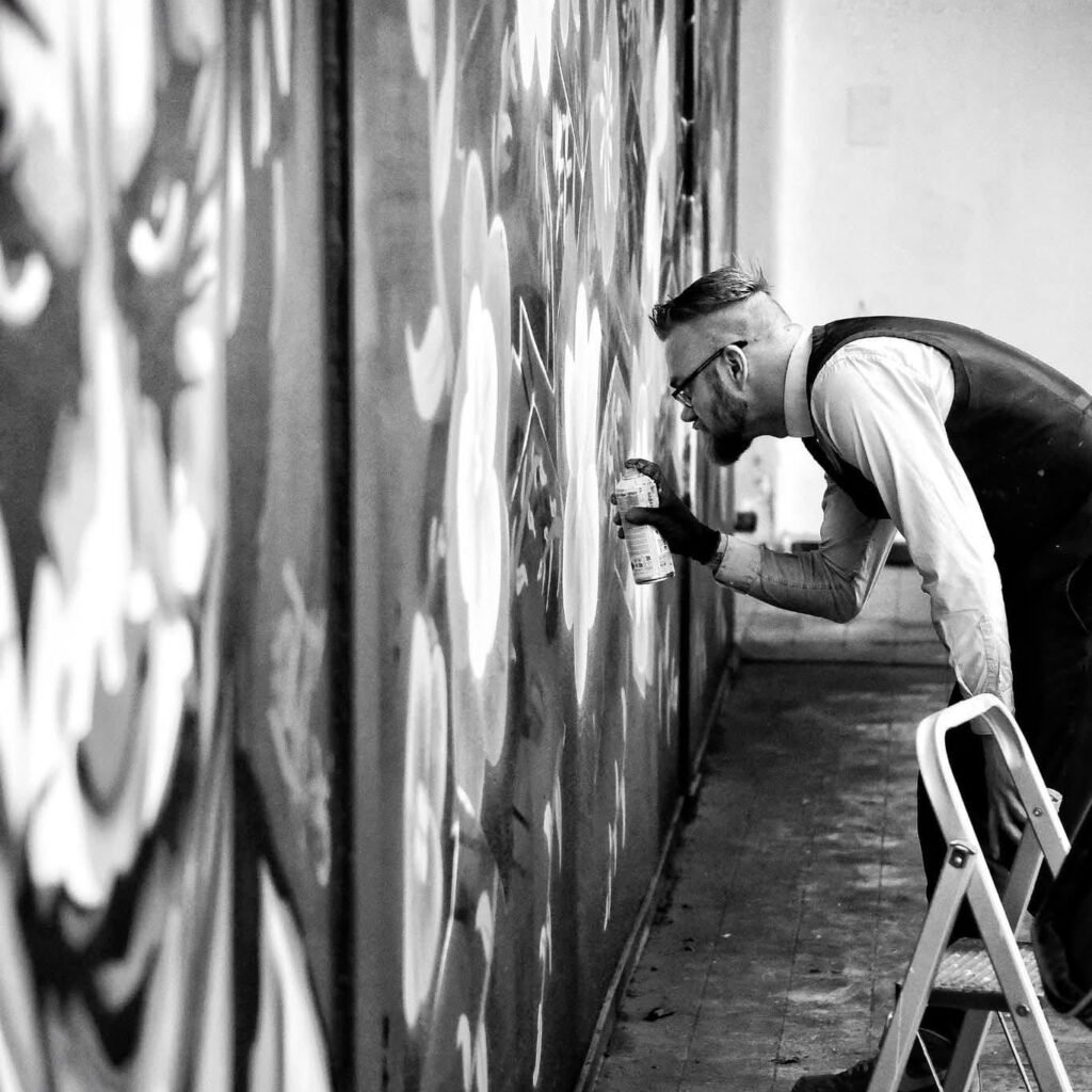 Fascinated from an early age by the graffiti covering the walls of his neighborhood, he soon began to devote himself to this art form as a self-taught artist. He later studied art at the Academy of Fine Arts in Urbino, where he graduated with honors, mastering techniques such as oil painting, acrylics, screen printing, and engraving. He temporarily abandoned street art to devote himself to tattooing, which became his main job, but later picked up his spray can again in a project called “ART ON TOUR,” where he combined his passion for art with his love of travel, living in his camper van and exploring and creating works in countries such as Greece, Spain, Portugal, Ireland, Switzerland, Luxembourg, Hawaii, the Netherlands, and Belgium. Inspired by his travels and the environment around him, he dreams of expanding the tour worldwide.
